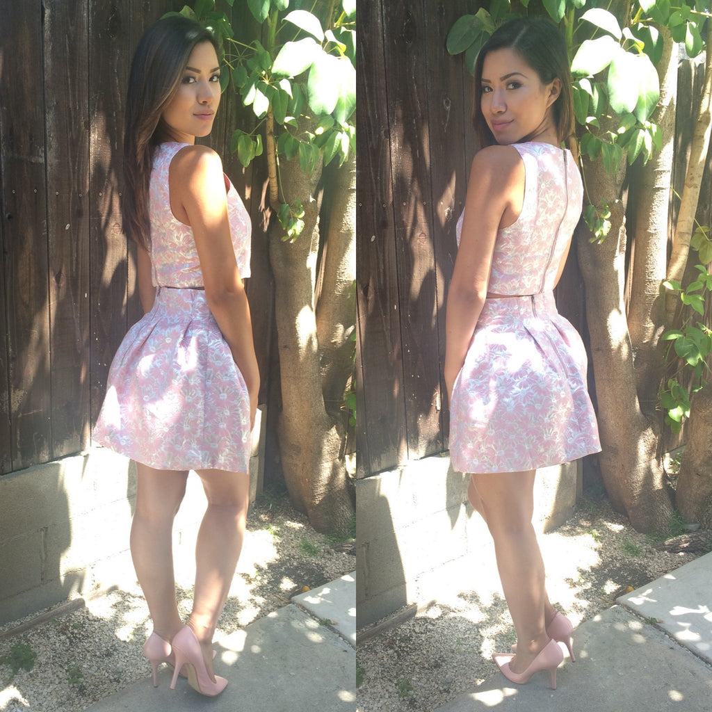Sleeveless V-neck crop top in pink with foil detail. Has back zipper closure.