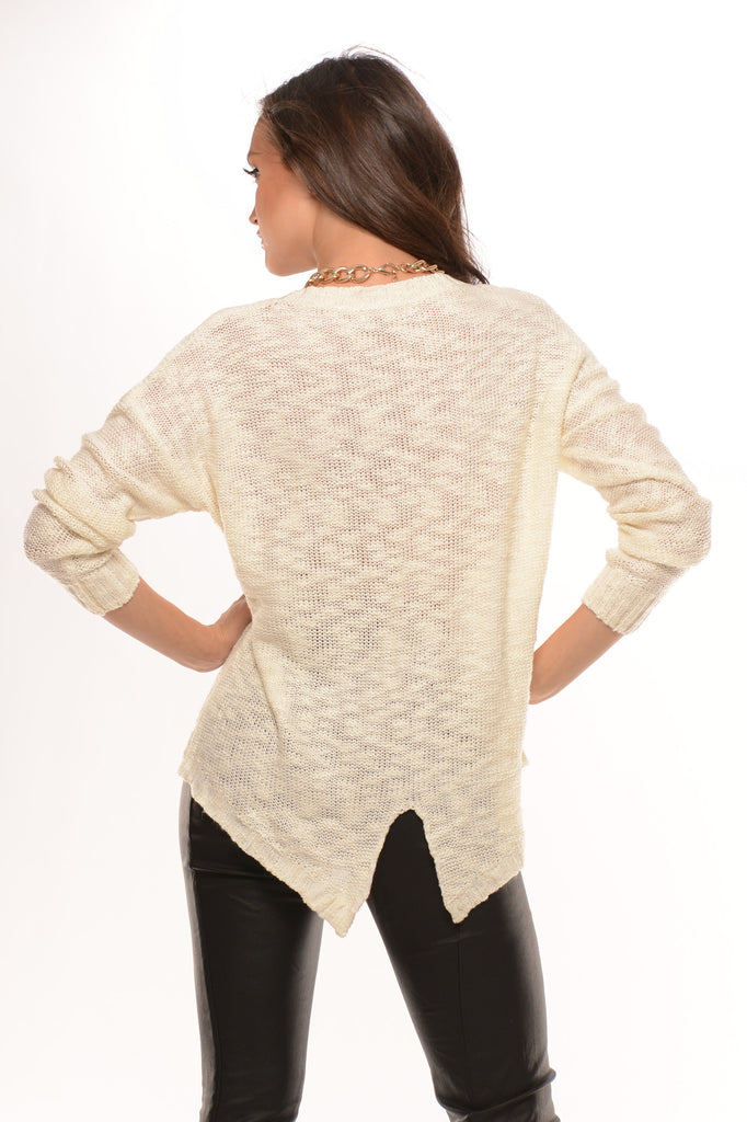 Cream Foil Print Sweater.  Model is wearing a Size Small