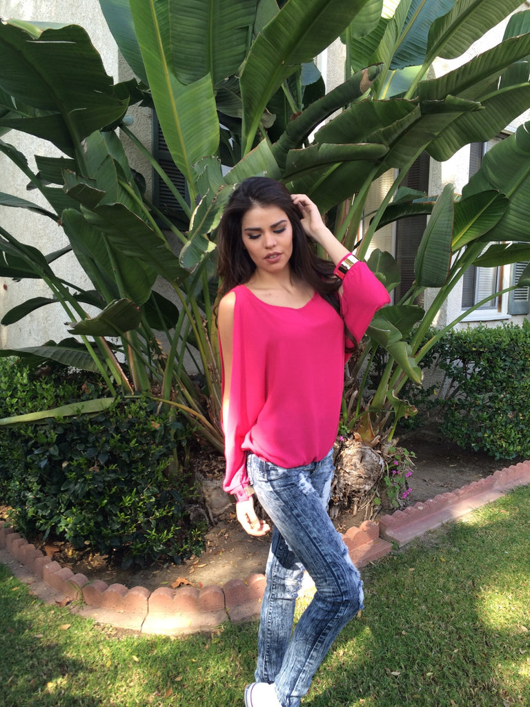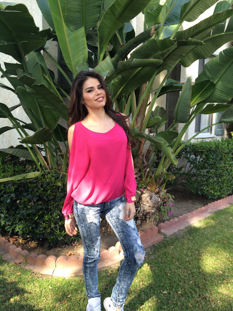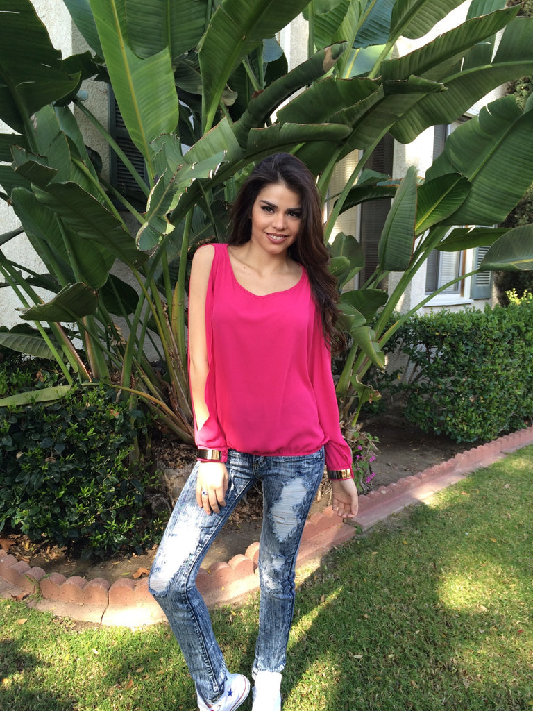 Skip the bracelets with beautiful long sleeve chiffon tank. Sleeves have slits and gold cuffs. Elastic at waist