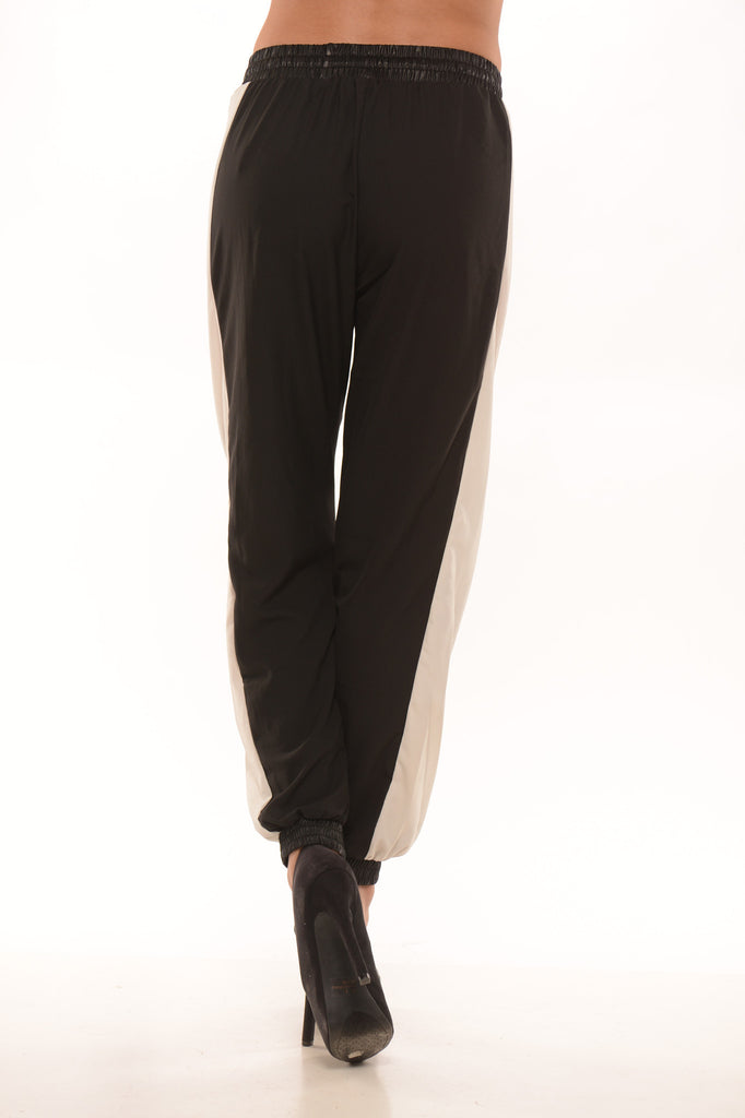 Harem Pants with two zipper pockets on both sides in Black and White. Waist line/ cuff of the bottom of the pants is leather.
