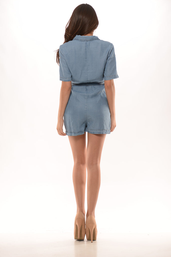 Jean romper with a light denim feel to it. Very Comfy!