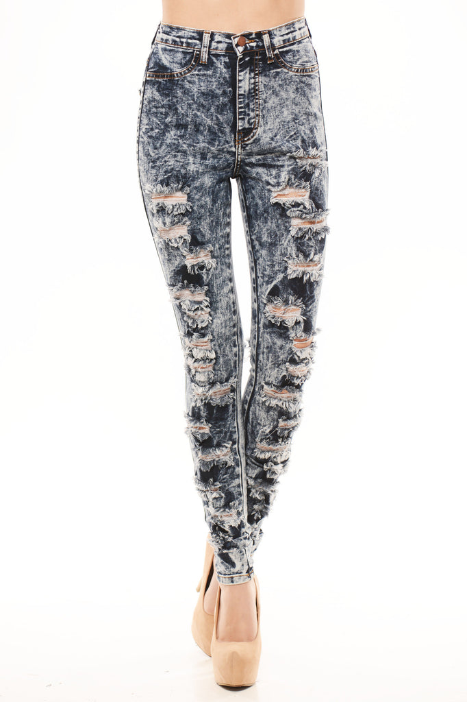 High waist jeans with distressed detail in front and back (all over) in acid wash.