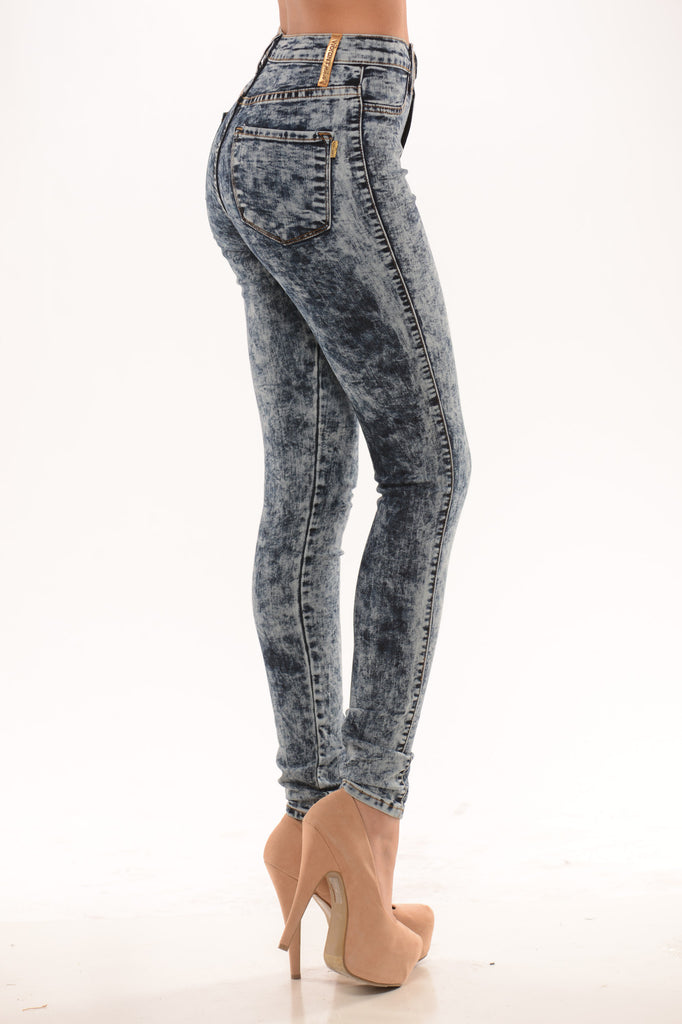 High-waisted jeans have made a comeback! These acid wash, stretchy jeans include two rear pockets. They look fabulous with basically anything!