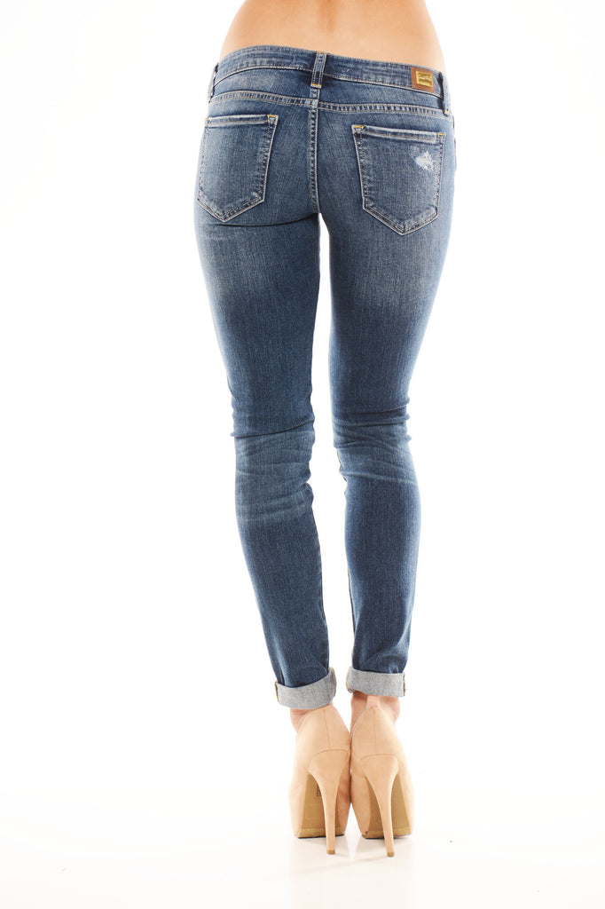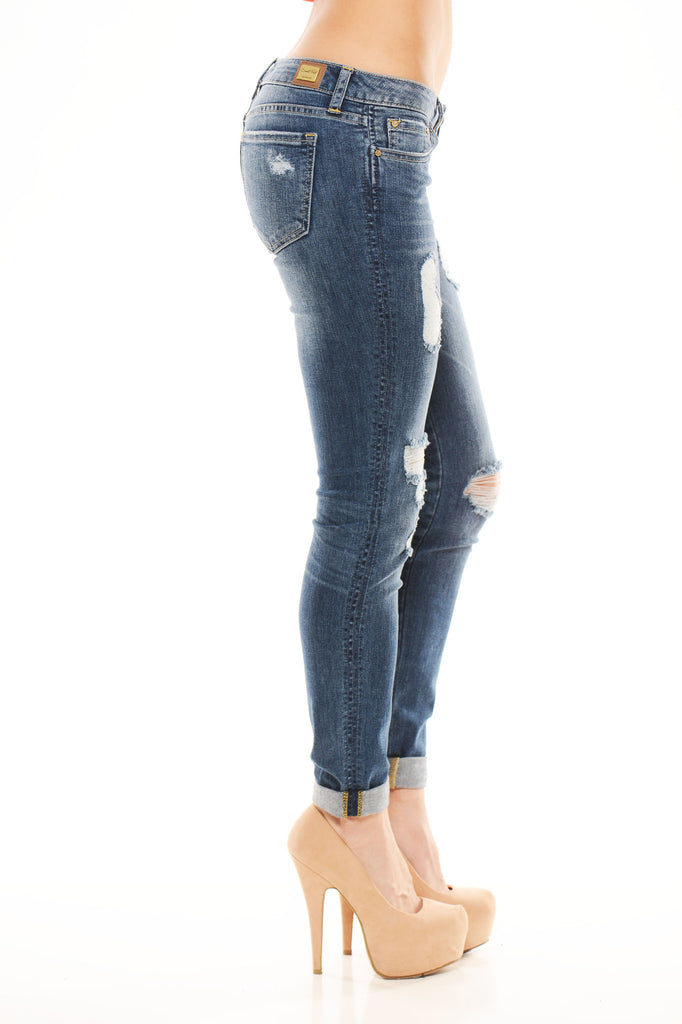 Skinny Distressed Low Rise jeans with 5 pockets and cuff.