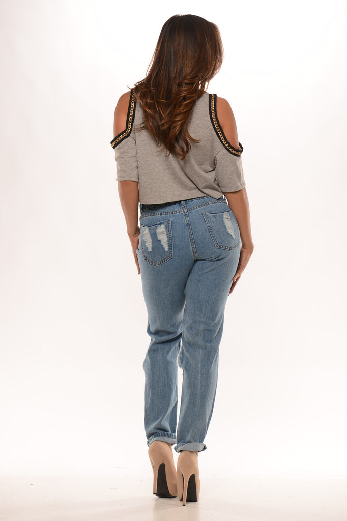 Open Shoulder Crop Top Lined with Gold Chains features foil print
