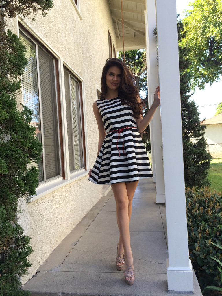 A white dress with black horizontal stripes and a cute red stringed belt.