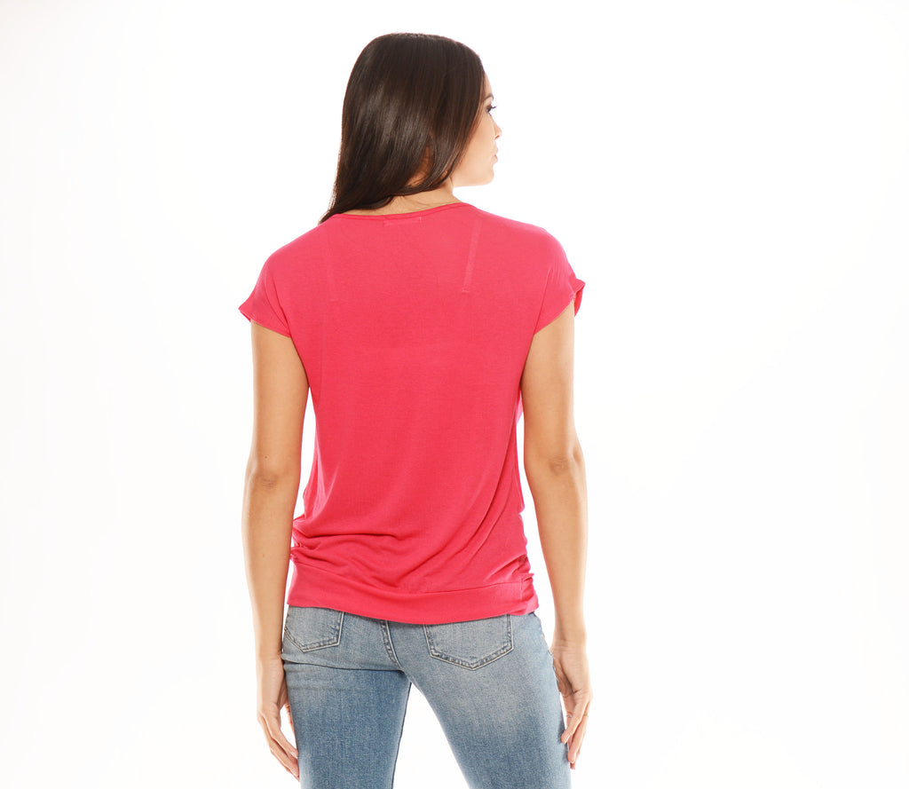 Knit lightweight short sleeve top with cutout twist detail in front.