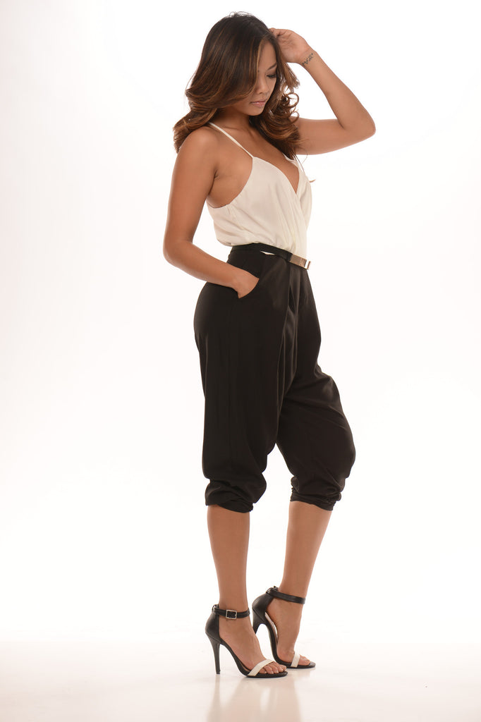 Spaghetti Strap Black and Ivory Halter Jumpsuit With Belt